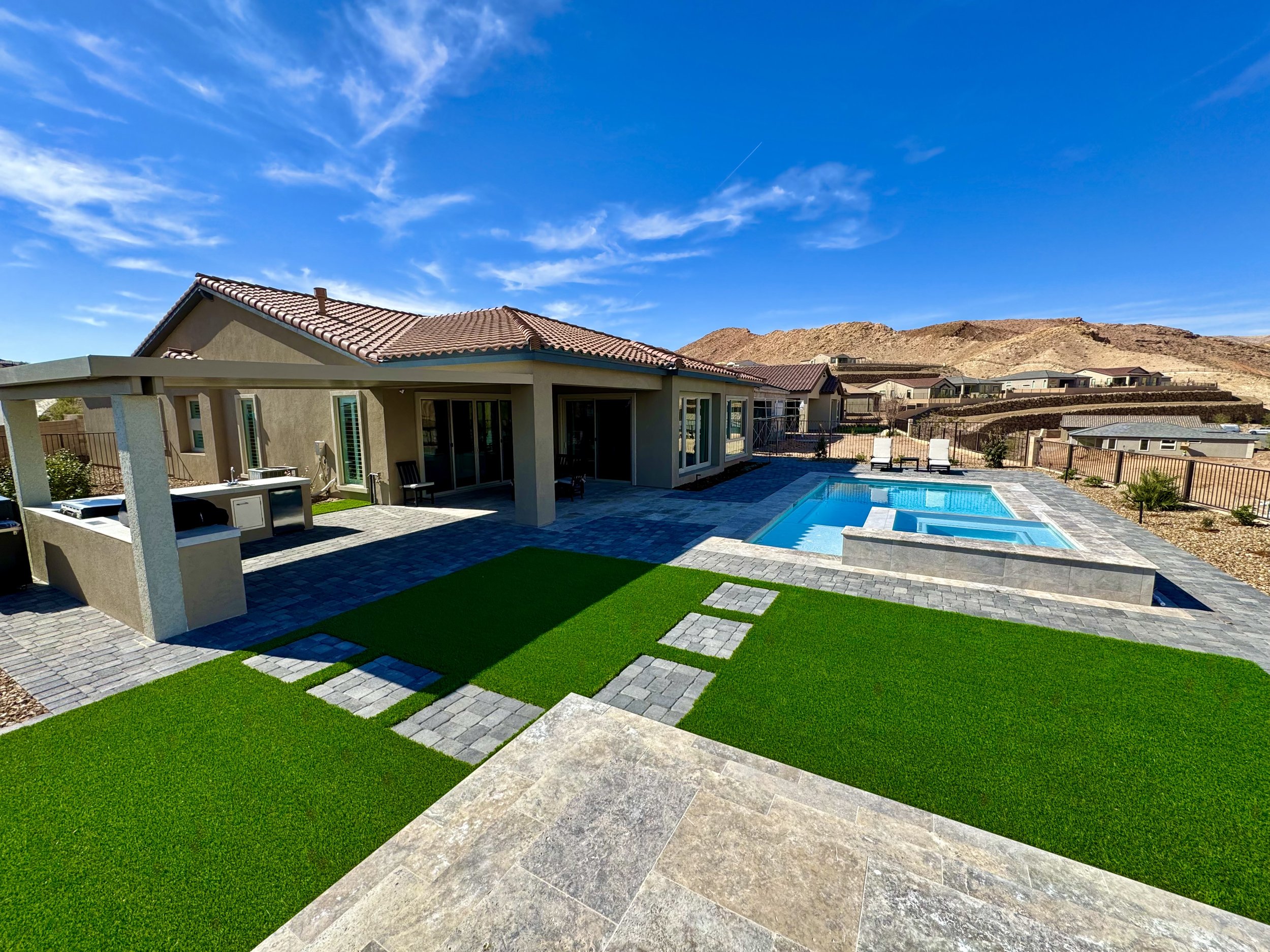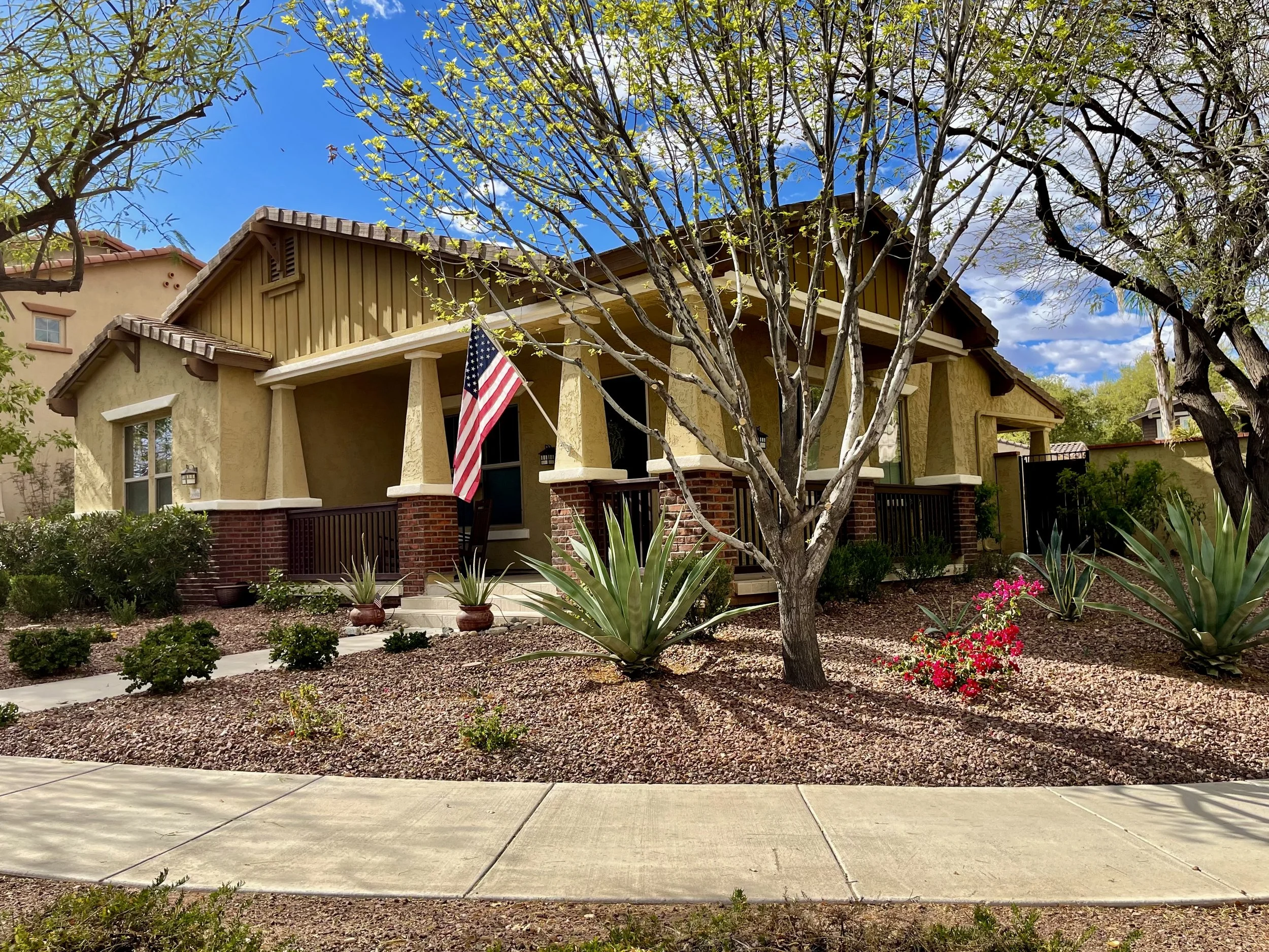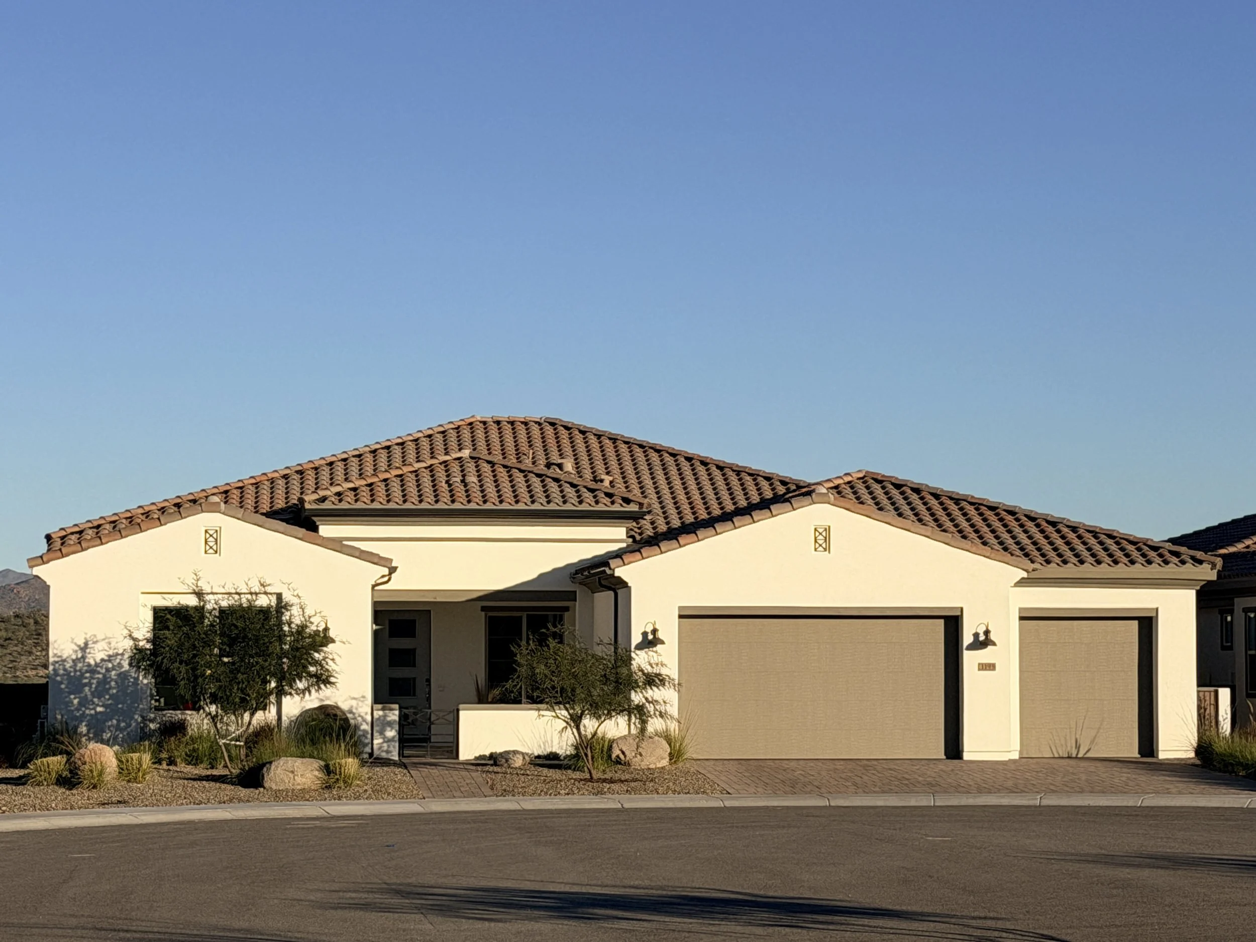 Beautiful mountain views welcome you into this Shea built 3 bedroom, 2 bath home. Enjoy tile flooring & 8 ft solid doors throughout, a chef's kitchen with SS Kitchen Aid appliances including gas 5-burner cooktop & hood plus beverage fridge, granite countertops & two-tone cabinets w/pull-outs. The Living Room is enhanced w/custom built cabinets & an electric fireplace while the dining room opens to the patio w/stacking slider. Bathrooms include quartz countertops & tile showers w/glass enclosures. Main bath offers dual vanities & private water closet. Step outside to an extended paver patio w/built-in BBQ, raised gardens, beautifully landscaped, completely fenced, private backyard. Mini-Split in 2 car garage plus separate golf cart garage w/overhead storage. Partially furnished, 4 TVs Stay.