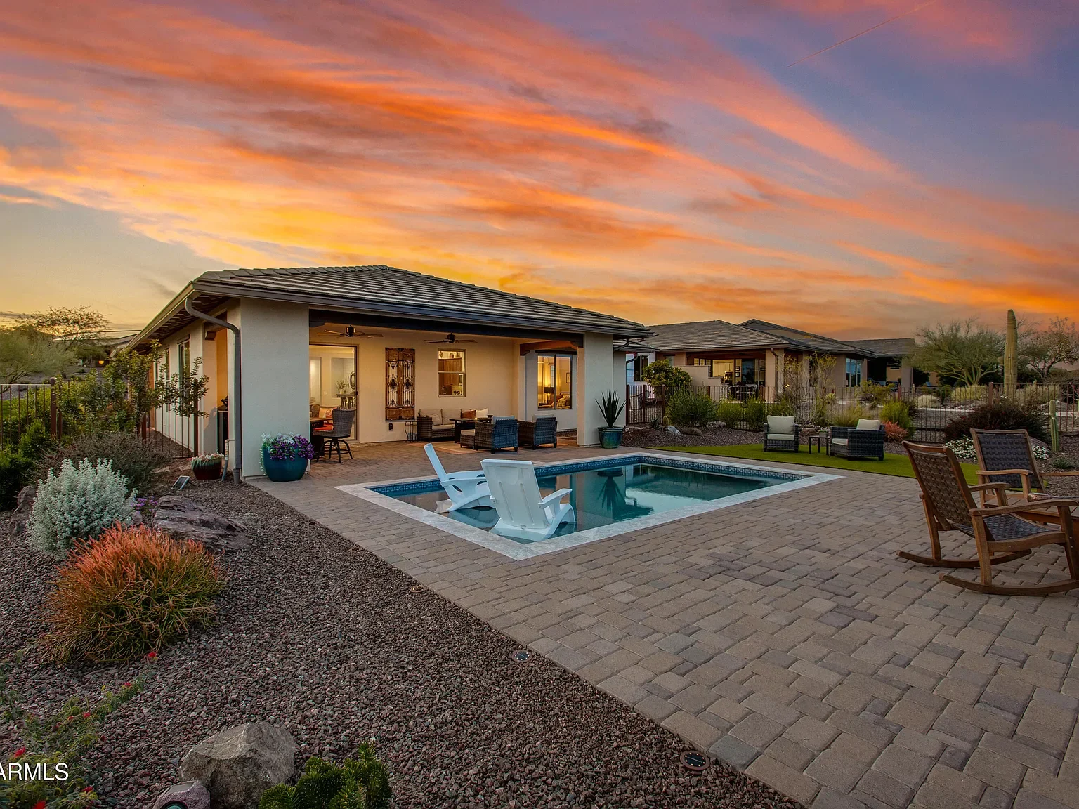 This stunning home has everything! Resort-style pool & spa plus sleek fire pit wrapped in travertine with peaceful mountain views, backing to open space. The expansive tile patio is an entertainer's dream with an outdoor fireplace, built-in BBQ, sink, mini-fridge & electric sun shade. The great room features soaring vaulted ceilings with surround sound, flowing seamlessly into a chef's kitchen with upgraded appliances including double convection ovens, food warmer, gigantic island & dual temp wine fridge. The split primary suite is a private retreat with dual vanities & spacious walk-in tiled shower. Beautiful custom Murphy bed in the versatile 3rd bedroom, OWNED SOLAR & golf cart garage complete this exceptional residence in the vibrant active adult golf community of Victory at Verrado.